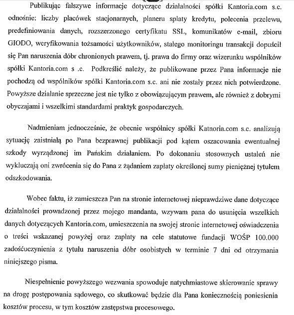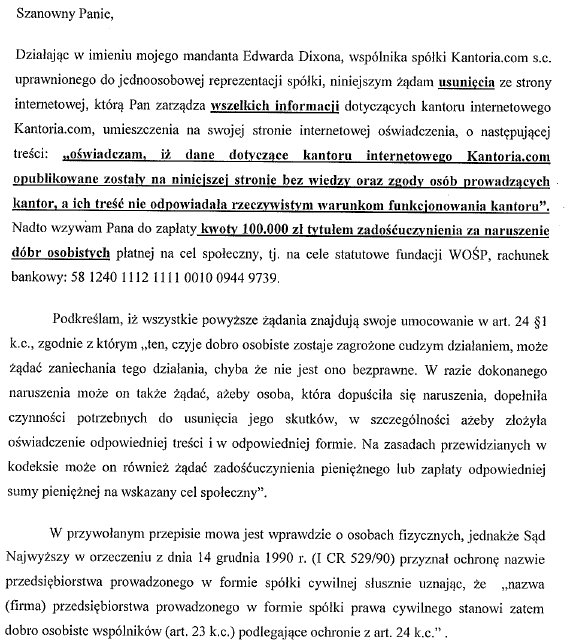 w imieniu Kantoria.com s.c. z powoÅ‚aniem na załączone peÅ‚nomocnictwo, przesyÅ‚am w załączeniu pismo dotyczÄ…ce naruszenia przez Pana dóbr osobistych. Z uwagi na utrzymywanie na swojej stronie internetowej nieprawdziwych informacji na temat funkcjonowania kantoru internetowego kantoria.com, wzywam Pana do zachowania jak w treÅ›ci wezwania. Nadmieniam, iż załączona korespondencja stanowi ostatniÄ… próbÄ™ polubownego zaÅ‚atwienia sprawy. W razie bezskutecznoÅ›ci wezwania, sprawa natychmiast skierowana zostanie na drogÄ™ postÄ™powania sÄ…dowego."